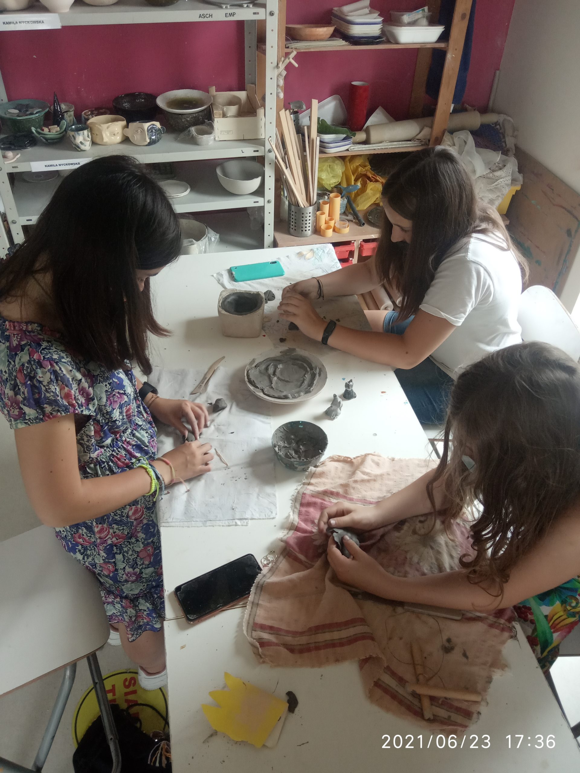 Uczymy się etapami podstawowych czynności, metod pracy, narzędzi i ich przeznaczenia. Nasze prace malujemy, szkliwimy i wypalamy.